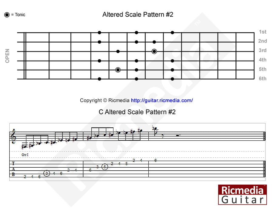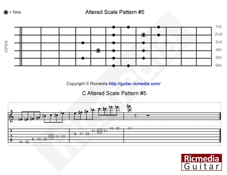 C Altered scale pattern #4 https://www.ricguitar.com/wp-content/uploads/altered-scale/c-altered-scale-pattern-4.mp3