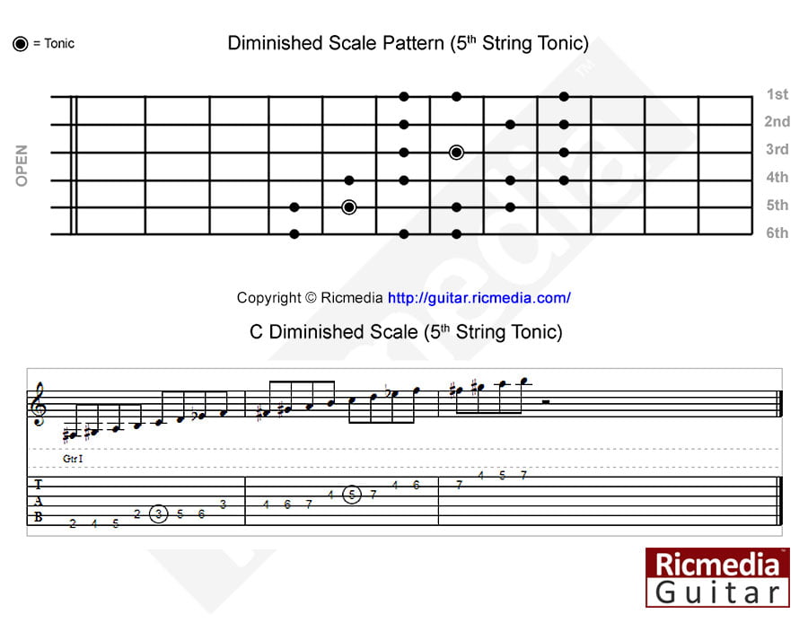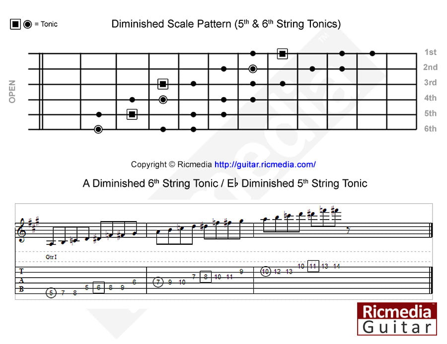The diminished scale, also known as the whole half scale, is an eight note scale with a numeric formula of 1-2-♭3-4-♭5-♯5-6-7-8/1. It is a symmetrical scale in that it follows a distinct pattern of steps, those being whole step, half step in a repeating pattern, not to be confused with the dominant diminished scale which follows a half step, whole step pattern. There are really only two distinct diminished scale patterns along with a third that covers most of the neck, this is due to the symmetry of the scale pattern. The first pattern has a sixth string tonic and the second has a fifth string tonic, the third pattern is an alternate that has an upward movement and has tonics on the fifth and sixth strings although in different keys.
