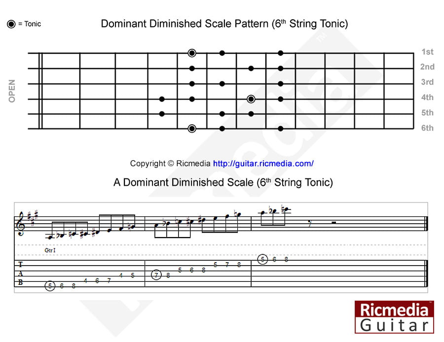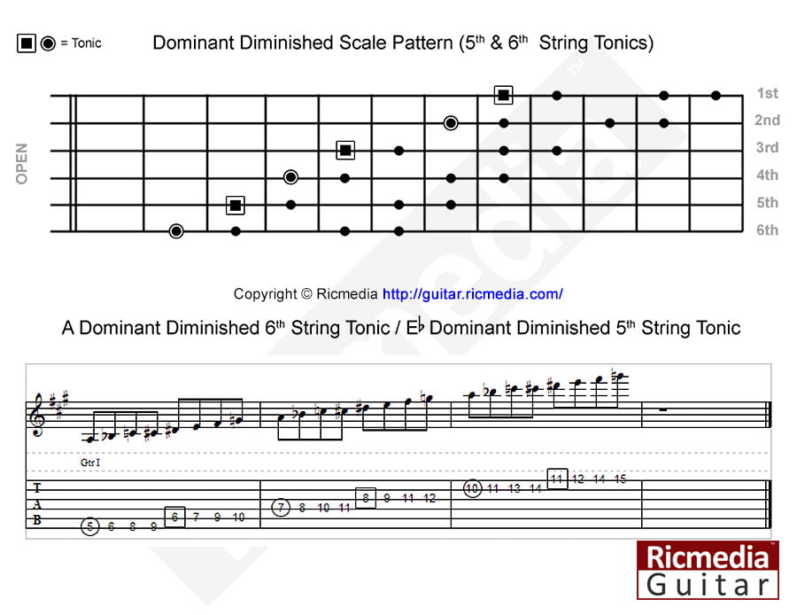Dominant diminished scale alternate pattern https://www.ricguitar.com/wp-content/uploads/dominant-diminished-scale/a-dominant-diminished-scale-fifth-and-sixth-string-tonics-alternate-pattern.mp3