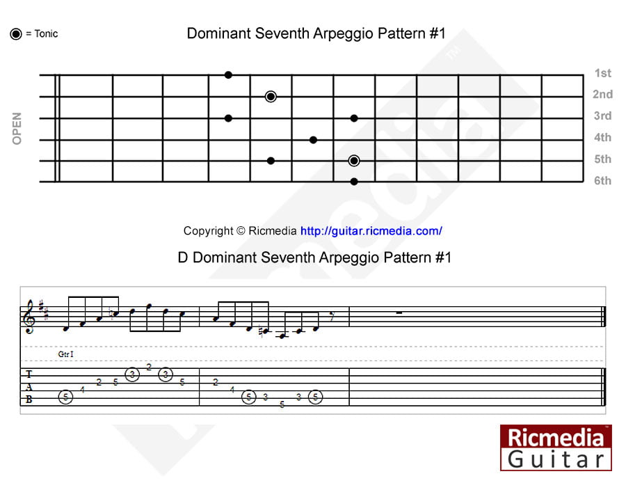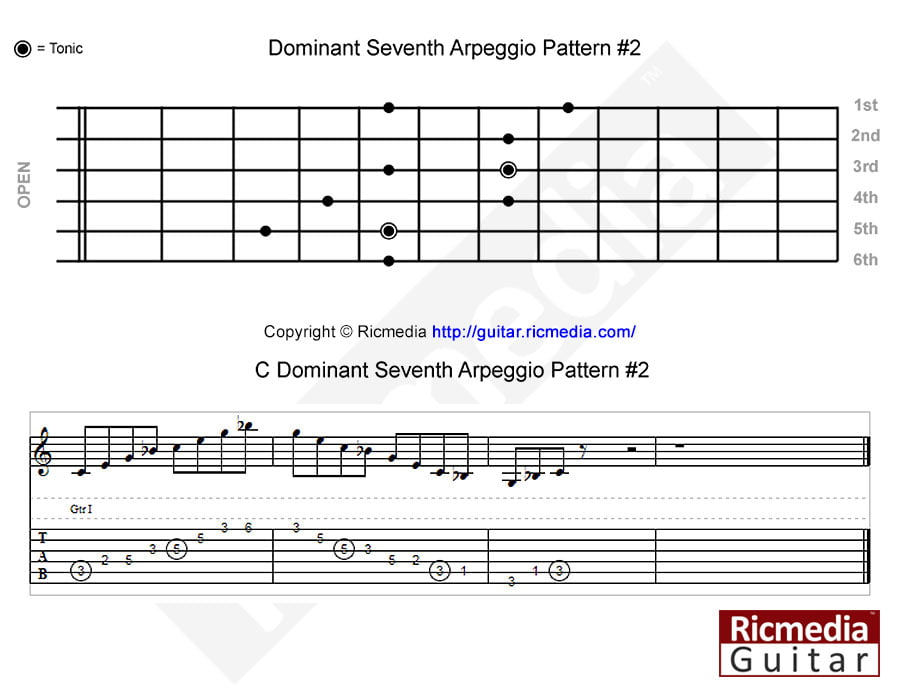 A dominant seventh arpeggio is a four note broken chord with a numerical formula of T/1-3-5-♭7 played as individual notes in sequence, the same as you would play a scale.
