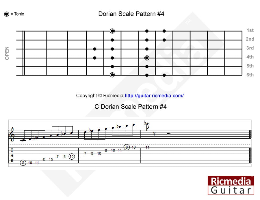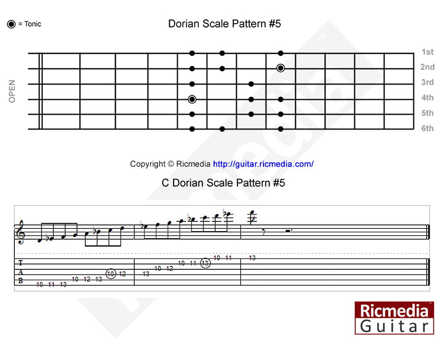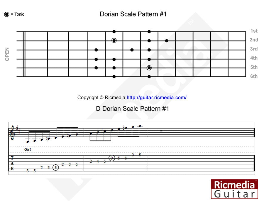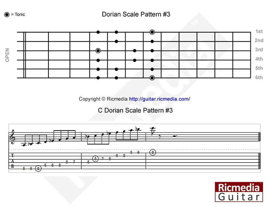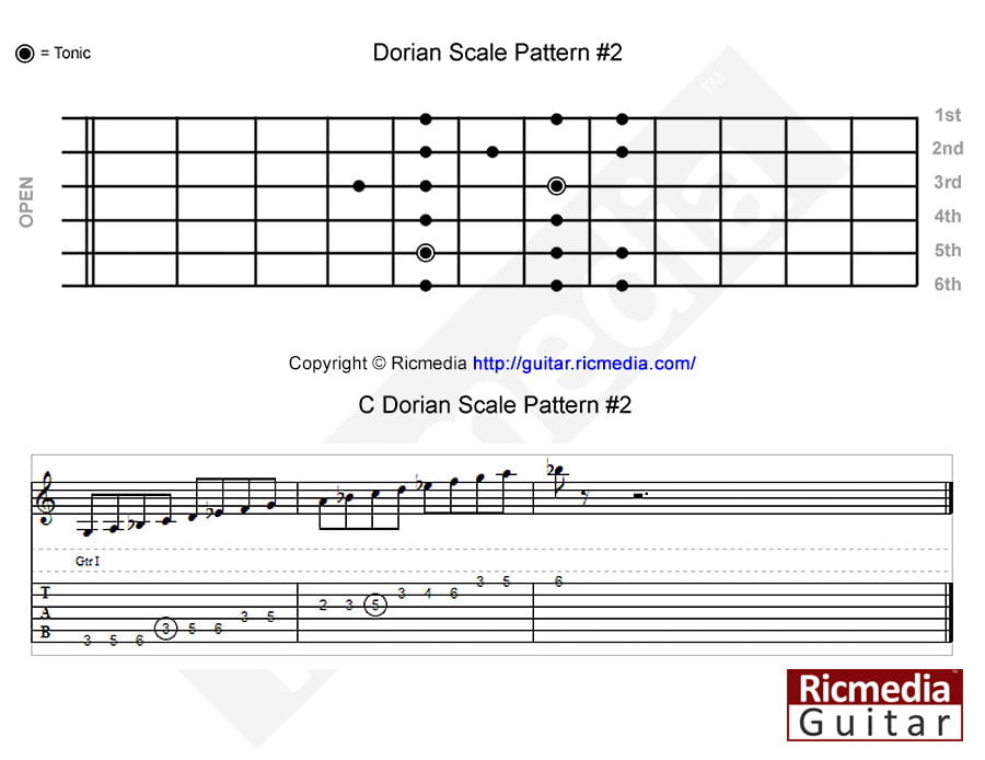 Dorian mode is a seven note scale with a numeric formula of 1-2-♭3-4-5-6-♭7-8/1 and is the second of seven modes from the Ionian/Major scale. Dorian mode has a minor tonality and is essentially a natural minor scale with a major sixth interval.
