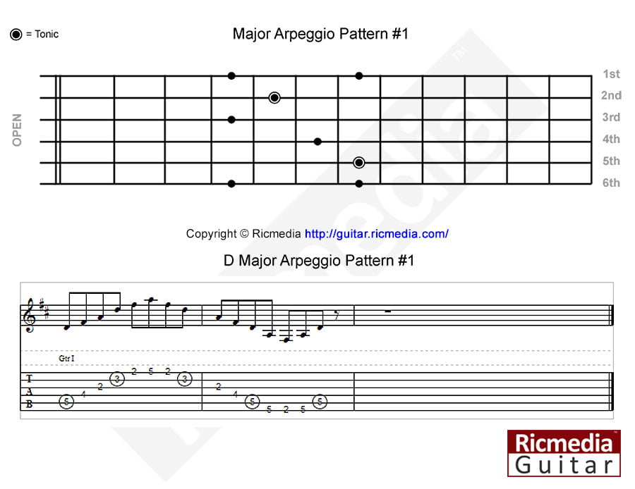 The major arpeggio patterns below are referenced as numbers #1, #2, #3, #4 and #5 which you will find correspond directly with the chord voicings, scale patterns and reading positions of the same number, for instance: major arpeggio pattern #4 is built from major chord voicing #4 which is built from major scale pattern #4 and all belong to reading position #4. The five positions cover the entire neck which gives us a structure to memorize scales, arpeggios and chords.