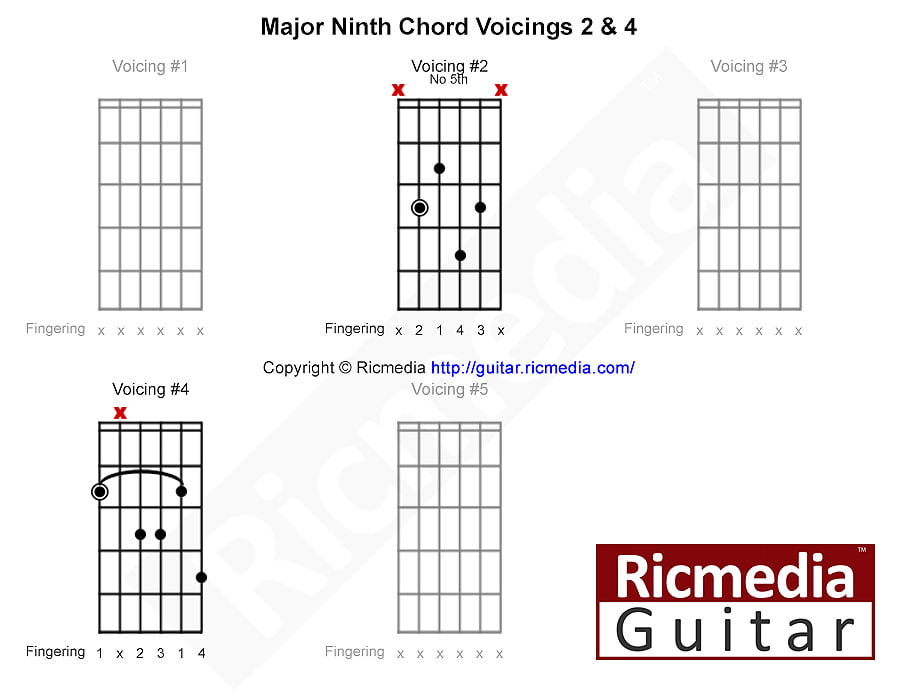 A major ninth chord is composed using a root/1st, major 3rd, perfect 5th, major 7th and major 9th (or R/1-3-5-7-9) intervals played simultaneously. Generally written as CMA9 or Cma7(add9), it is good practice to simply use an uppercase C, then the uppercase letters MA followed by a super scripted 9 to represent it in writing (ie: CMA9).
