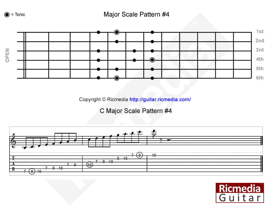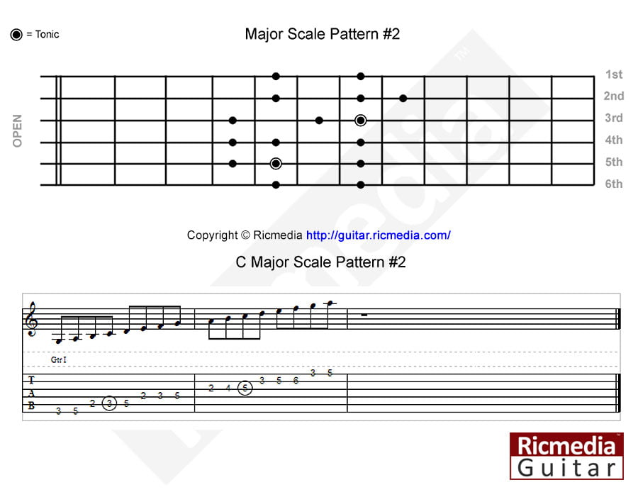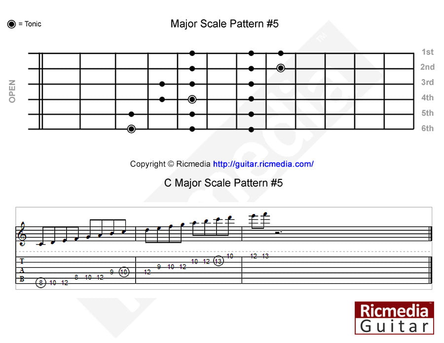 The major scale patterns below are referenced as numbers #1, #2, #3, #4 and #5 which you will find correspond directly with the chord voicings and reading positions of the same number, for instance: major chord voicing #4 is built from major scale pattern #4 and both belong to reading position #4. The five positions cover the entire neck which gives us a structure to memorize scales and chords. This same pattern numbering applies to all the scale, chords, arpeggios and reading position numbers on this website.