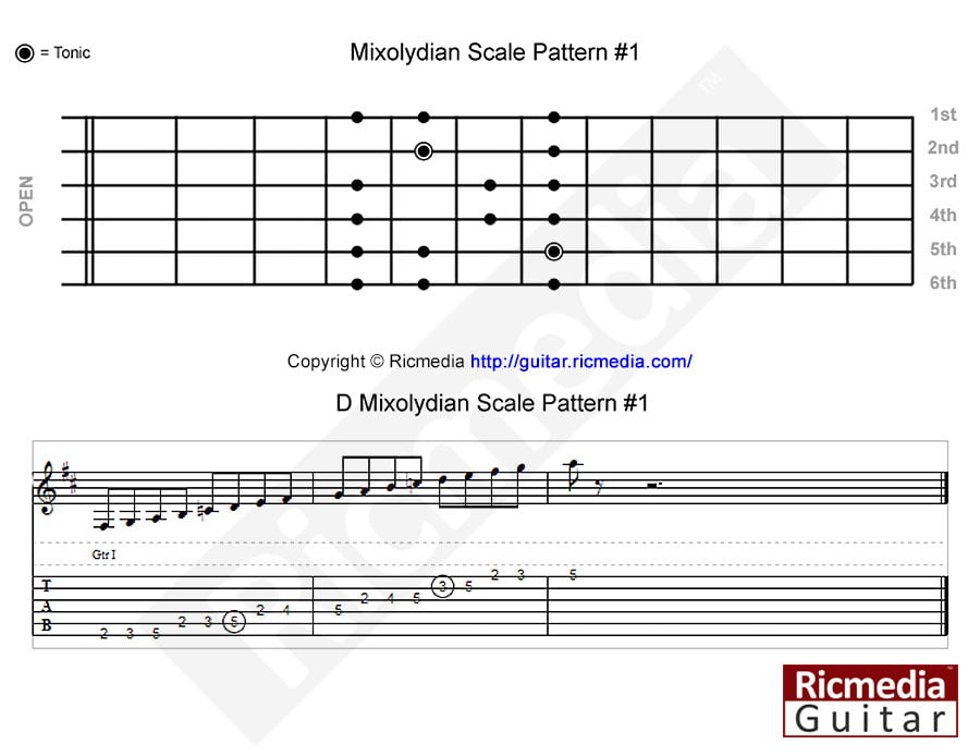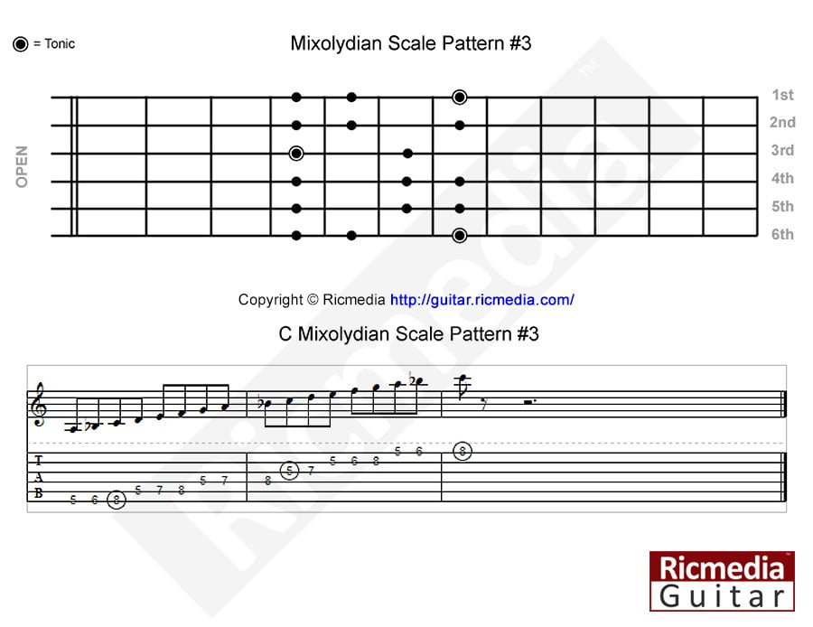 Mixolydian mode is a seven note scale with a numeric formula of 1-2-3-4-5-6-♭7-8/1 and is the fifth of seven modes from the Ionian/Major scale. Mixolydian is the only mode that has a dominant tonality and is essentially a major scale with a minor seventh interval.