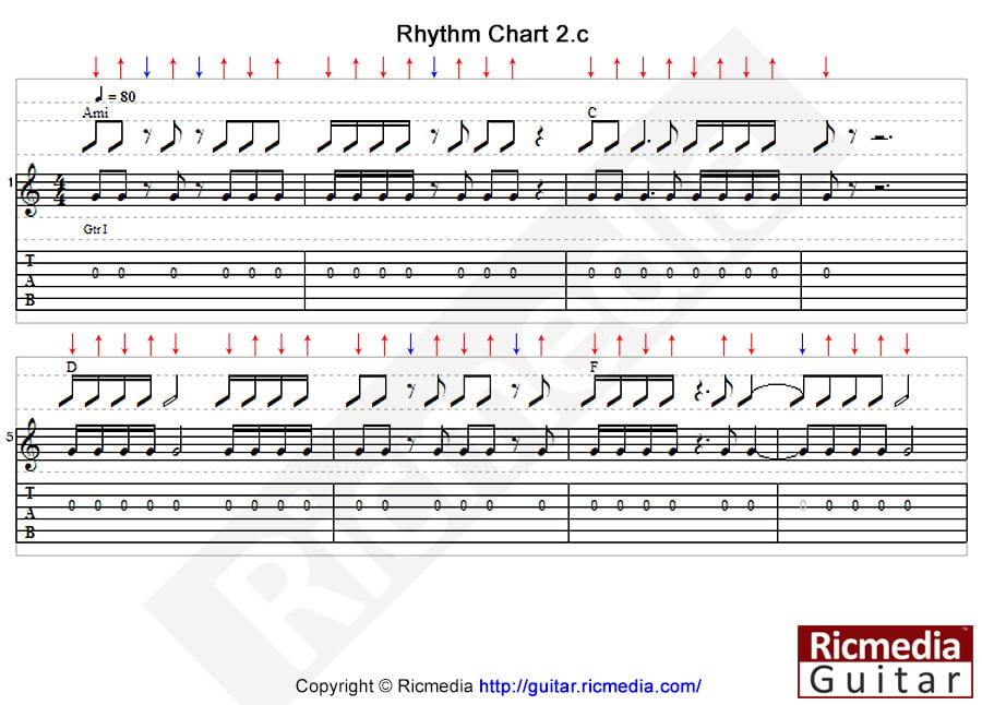 Ok let’s get straight into it starting with chart 1.a, you have the option of either playing chords and strumming the rhythm (for more advanced players) or alternatively you can simply play an open G note (third string open) and concentrate on the rhythm only, which is the goal here. As you can see I have included red arrows above each rhythm slash/note to help you with up and down strumming or picking. Set your metronome to around 80bpm/Adagietto and count in four beats before starting the chart. If you need an idea of what this rhythm chart should sound like, then play the sound sample further below.